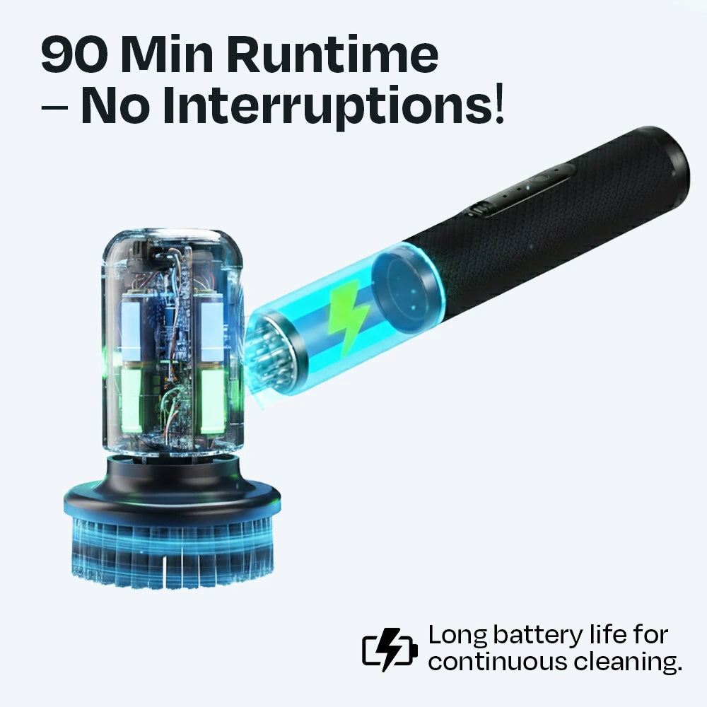 Cleaning is faster and easier with the scrubber. Its powerful spinning brushes do the hard work while you guide it, reducing strain on hands, arms, knees, and back. From home floors to bathroom tiles and car surfaces, it saves time, effort, and keeps every space spotless.