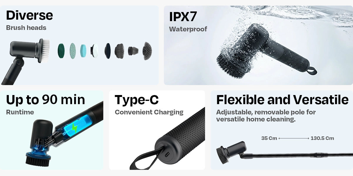 It has 7 different brush heads which makes this scrubber super versatile. I can clean everything from sinks and floors to shower corners and even my car tires. It really replaced several cleaning tools in one, and I love the convenience.